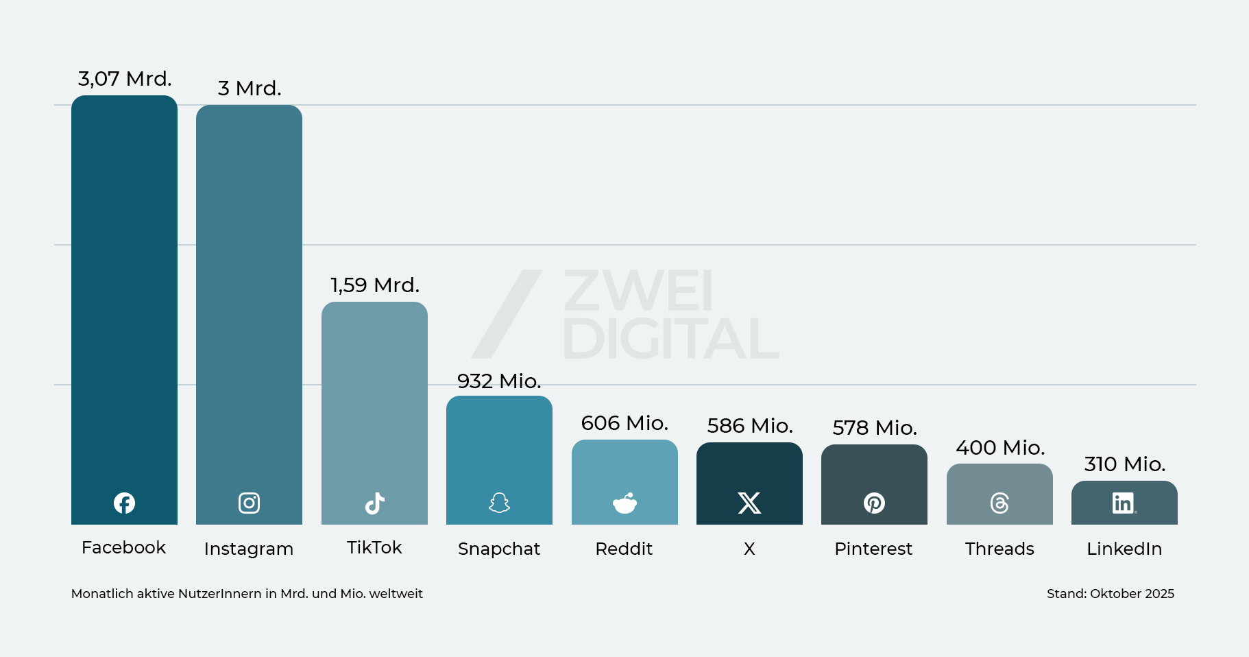 Übersicht aktuelle Social Media Nutzerzahlen (monatlich aktive Nutzer) in Mrd. und Mio. Deutschland