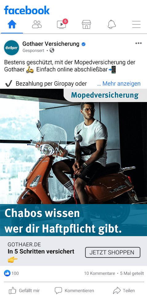 Mit Collection Ads in eurem Facebook News Feed könnt ihr eure Produkte super ansprechend präsentieren. Ihr startet mit einem Titelbild oder Video und packt noch drei Produktbilder dazu. Wenn jemand auf eure Anzeige tippt, landet er direkt auf einer Instant Experience – das ist eine Art Vollbild-Landingpage, die richtig Bock auf mehr macht und zum Interagieren, Stöbern und Kaufen anregt.